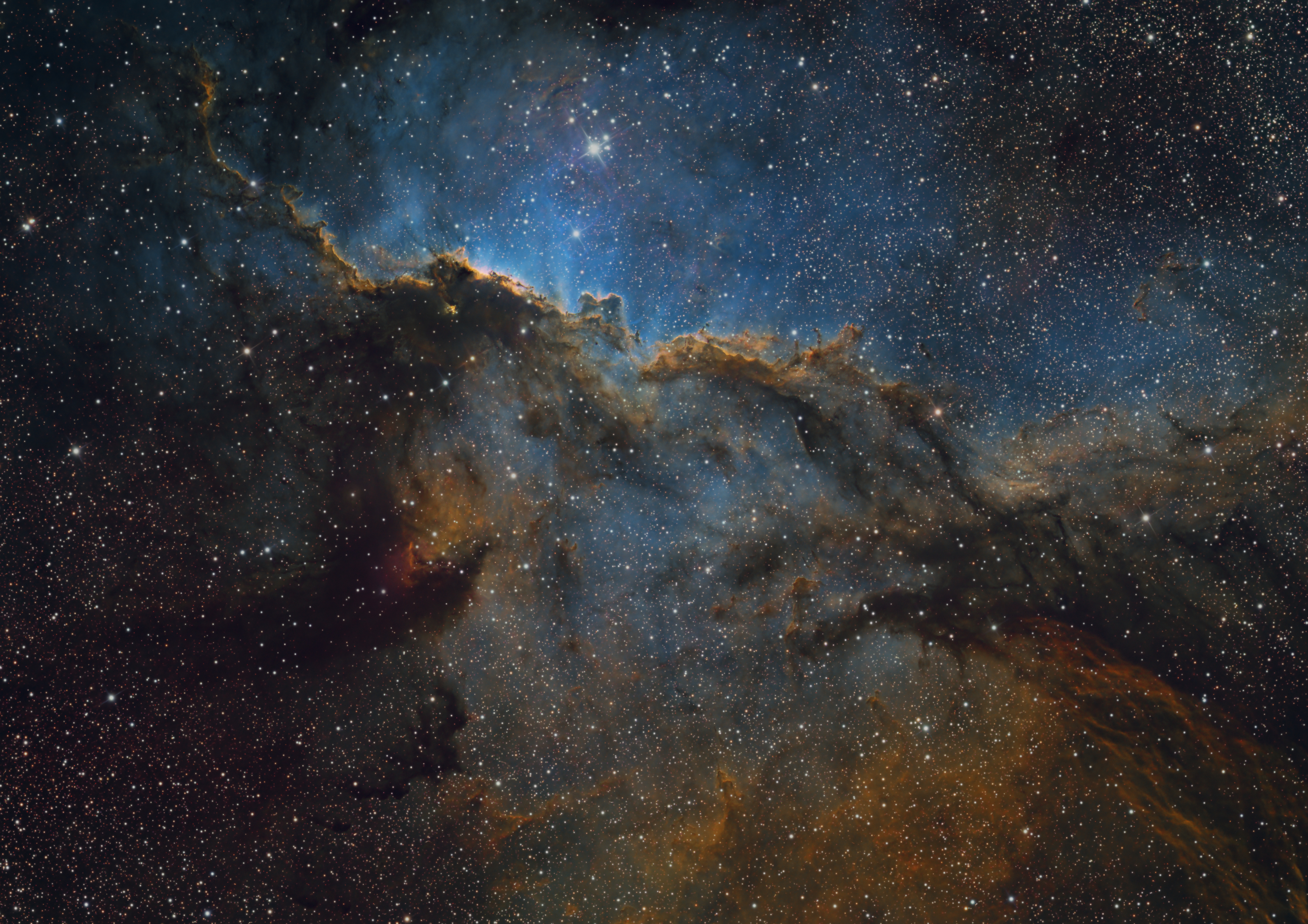Aufnahmedauer: 6,7 h (39 x 180s Ha / 35 x 180s OIII / 30 x 180s SII + 10 x 180s R/G/B für Sterne)