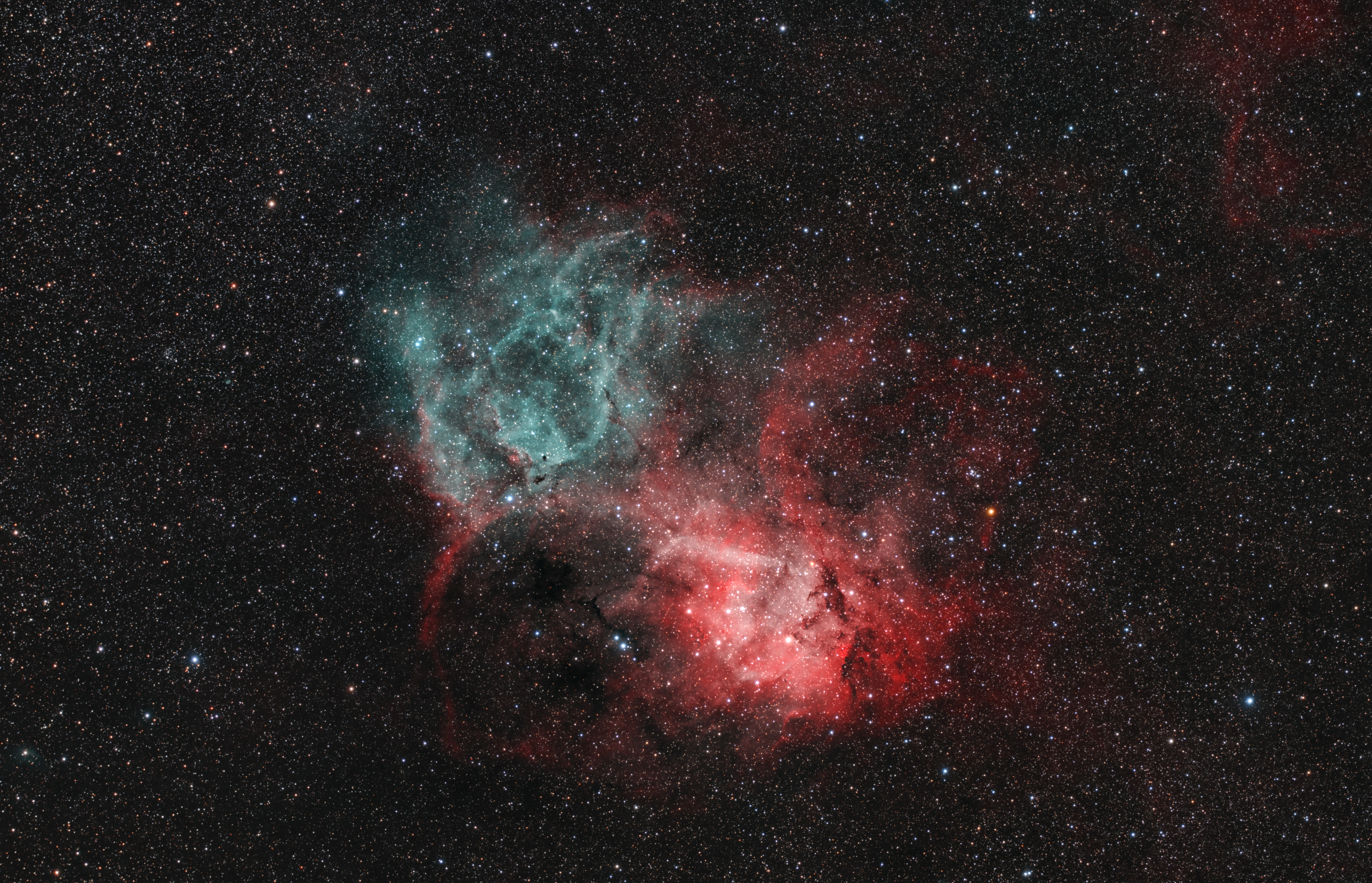 Belichtungszeit: 100x180" Ha; 120x180" OIII; 30x60" R; 30x60" G; 30x60" B (Gesamt: 12,5 Stunden)