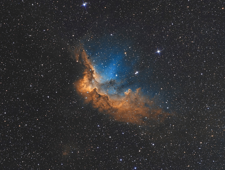 Belichtungszeit: 29x120" Ha; 30x120" OIII; 30x30" R; 30x30" G; 30x30" B (Gesamt: 2,7 Stunden)